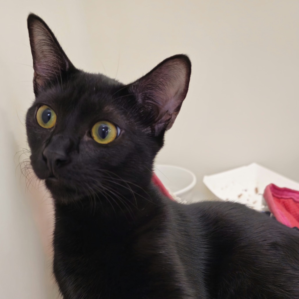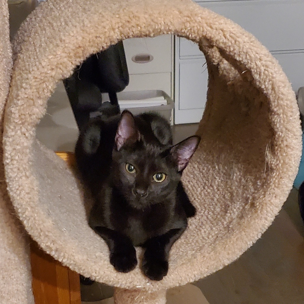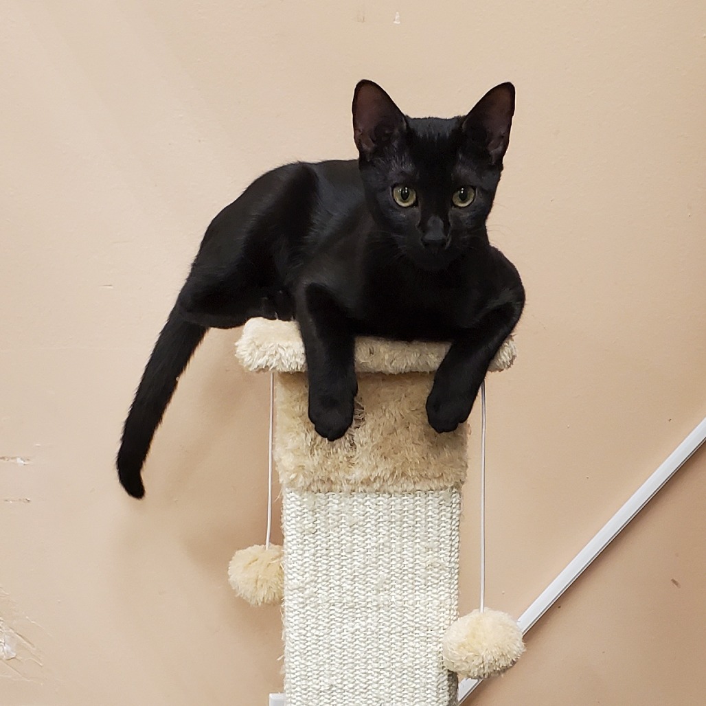 Cypress is a smart, playful girl with silky black fur. Spring and tunnels are her favorite toys. She enjoys investigating her surroundings. Meal time and treat time are welcome activities. She likes meeting new friends and gets along with others in a home.