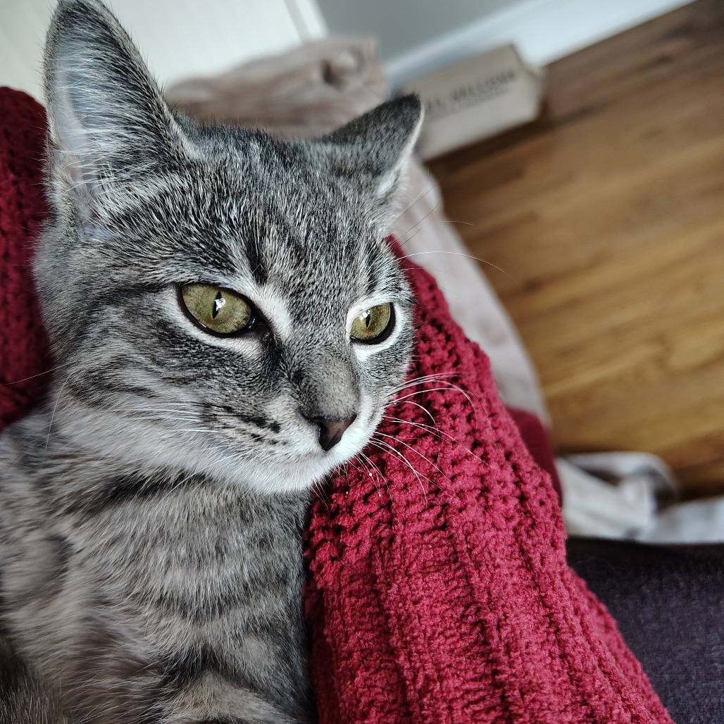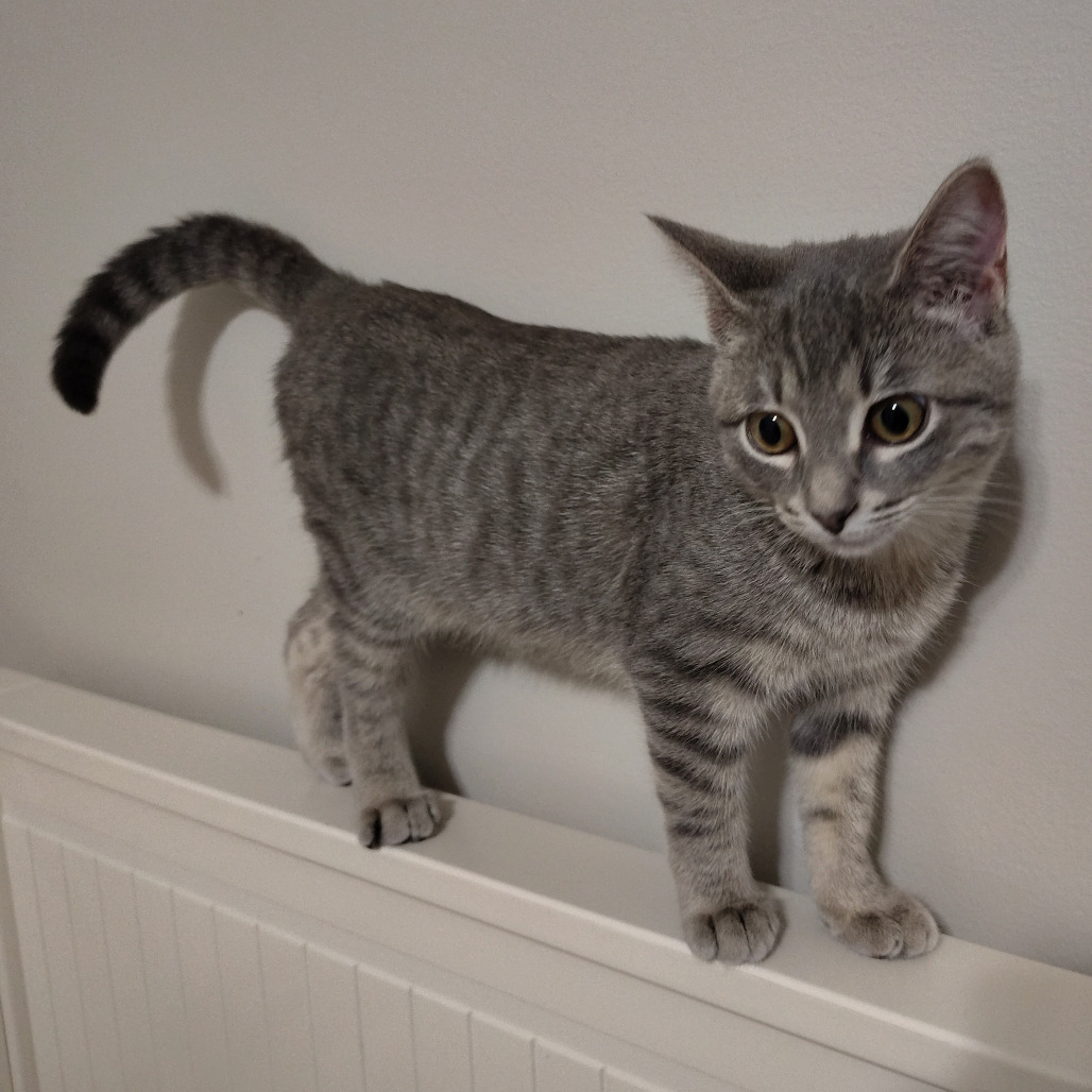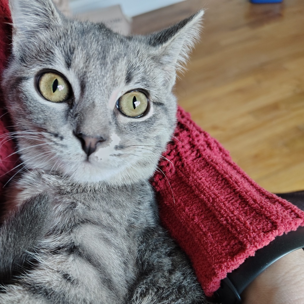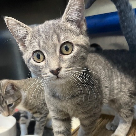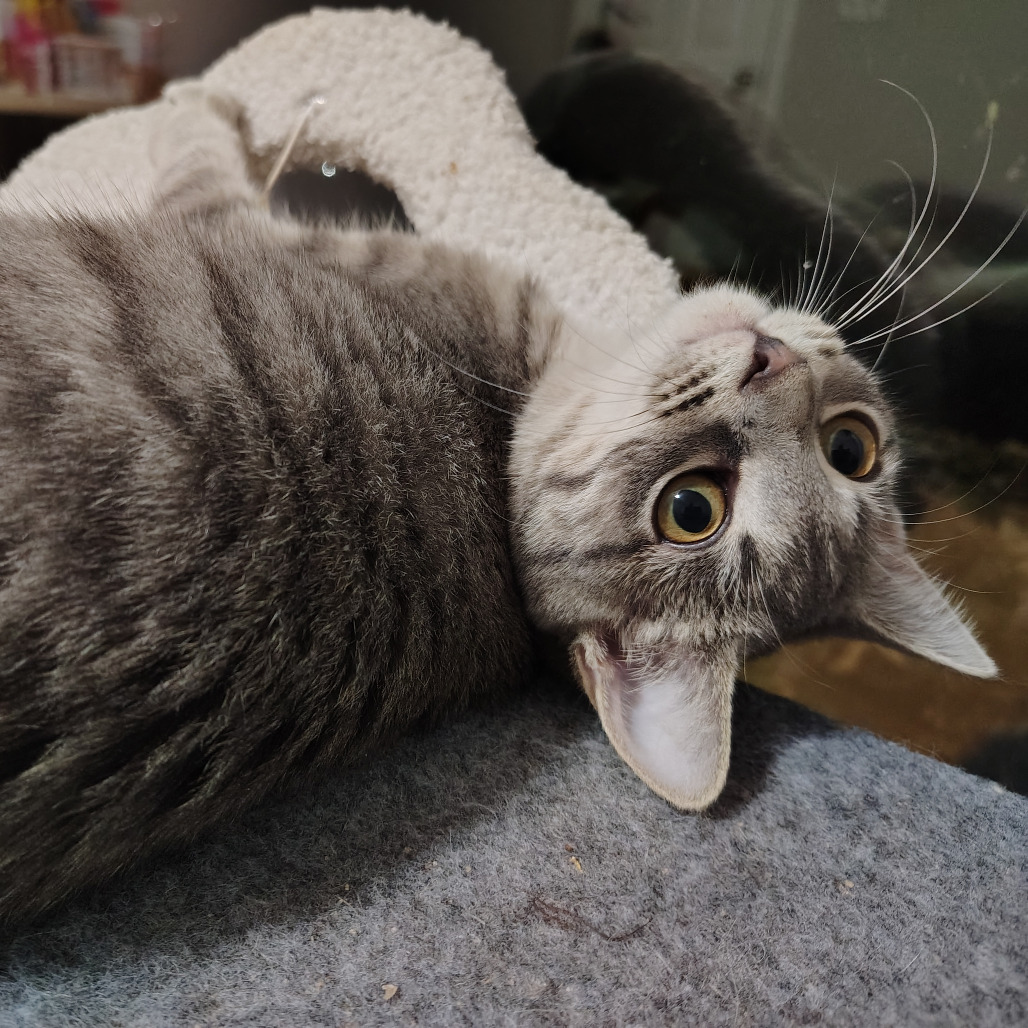 Meet Dolly, a young and friendly grey tabby cat with a zest for life. Dolly is not just energetic; she's also cuddly, always ready to snuggle up with anyone who needs a warm, purring companion. Adopting Dolly means bringing home endless joy and companionship, perfect for anyone looking for a loving and lively friend. She loves her brother Dudley. She has not been around other cats or dogs in her foster home, so it's not clear how she would behave with other pets.