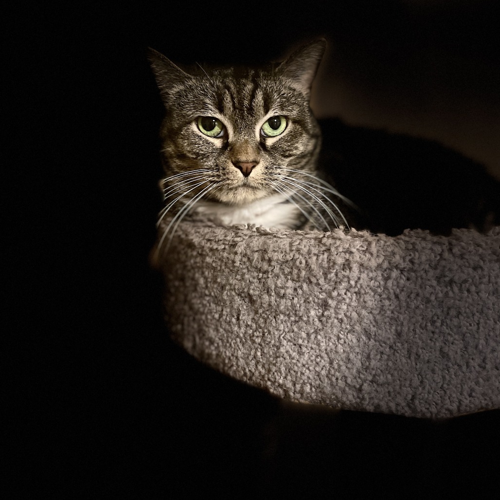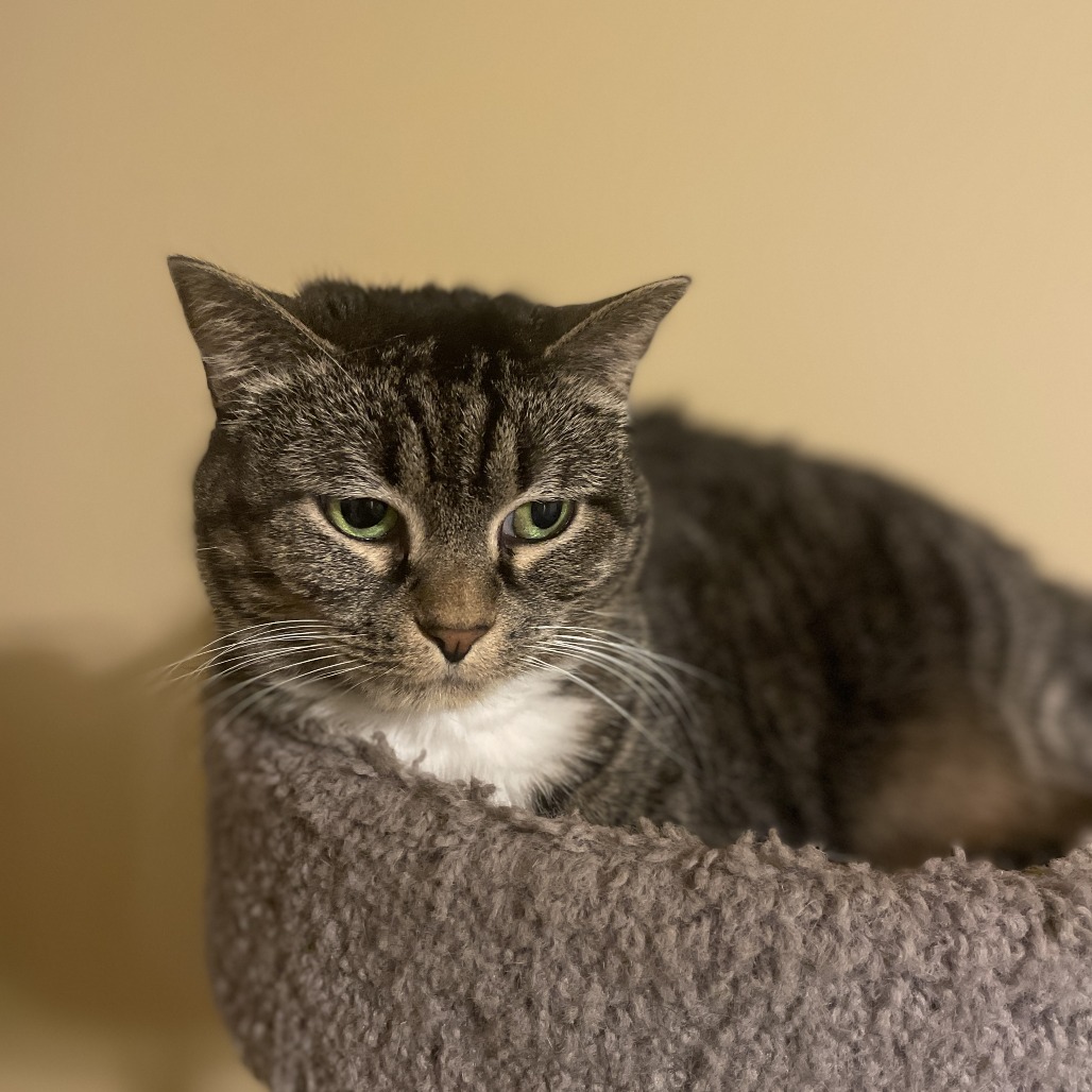 Emme is the perfect kitty for a quiet, relaxed home (maybe a single person or a young or older couple with no kids) who just wants a companion, and doesn't expect a lot from her. She loves nothing more than to perch at the top of her cat tree - a cat tree is going to be a MUST in her new home - and venture down to sit with you and get pets, when she is very loving and cuddly. She would prob do just fine in a home with another cat who accepts her.