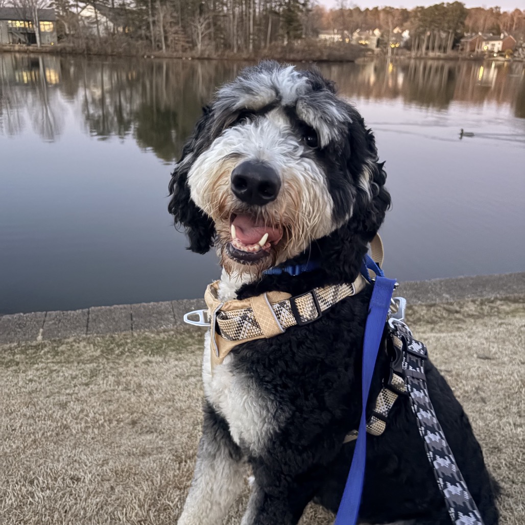 Hiccup is an absolutely incredible Bernedoodle with a wonderfully even temperament that makes him stand out from the crowd. Big and handsome, he turns heads on walks. He’s generally very easy to walk and does well on a leash, but he is a big dog and can pull towards things he wants to sniff.