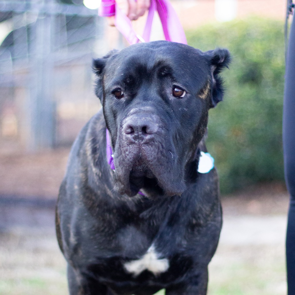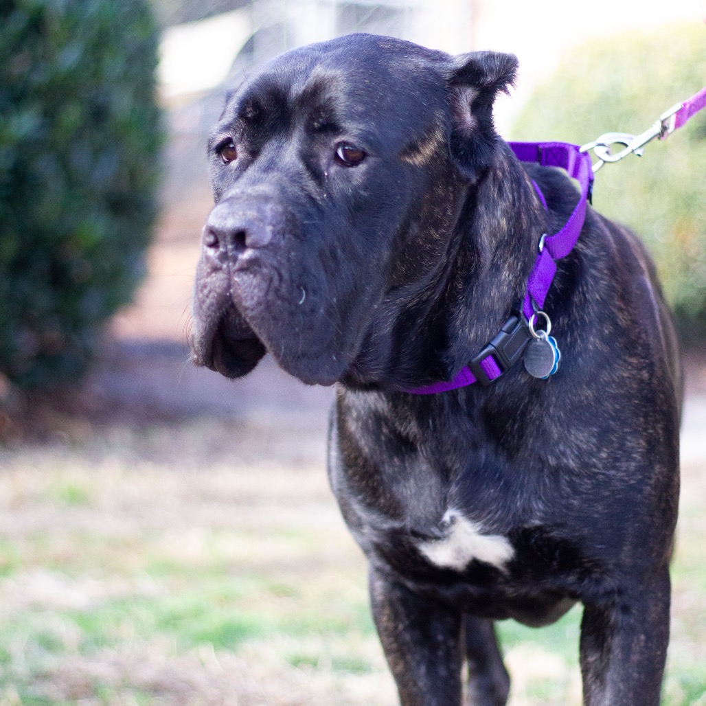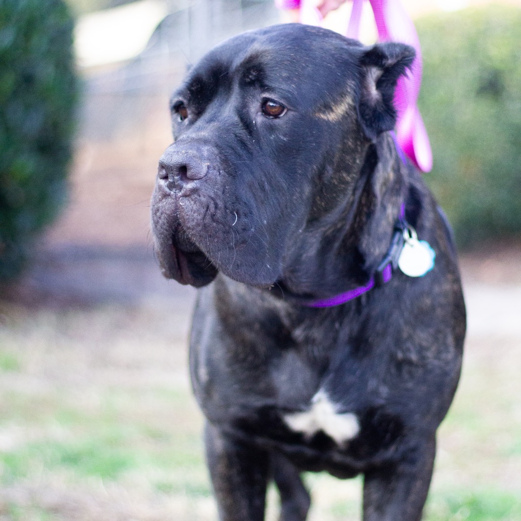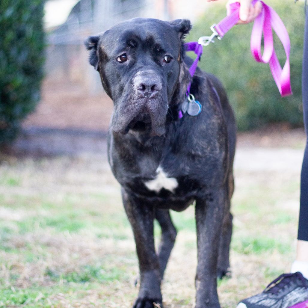 I’m a brindle Mastiff with a huge heart and an even bigger love for people. I was underweight and recovering from a fractured pelvis, but I’ve healed up well and am doing great now. I won’t be running marathons, but I’m perfectly happy strolling a fenced yard and can climb stairs with no problems.