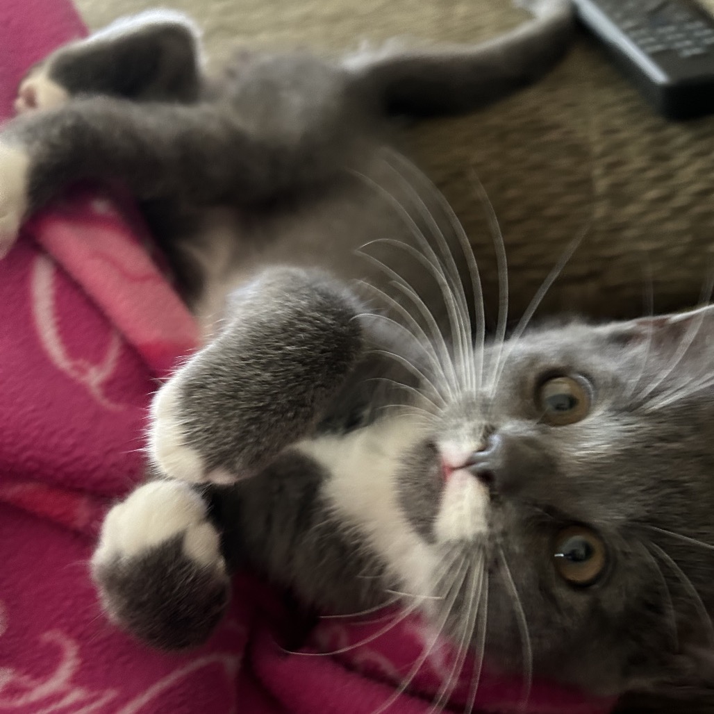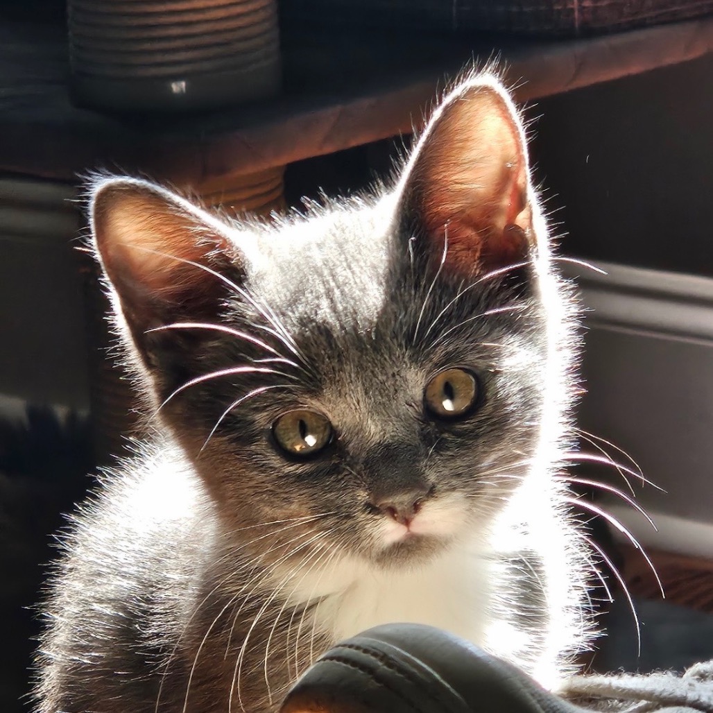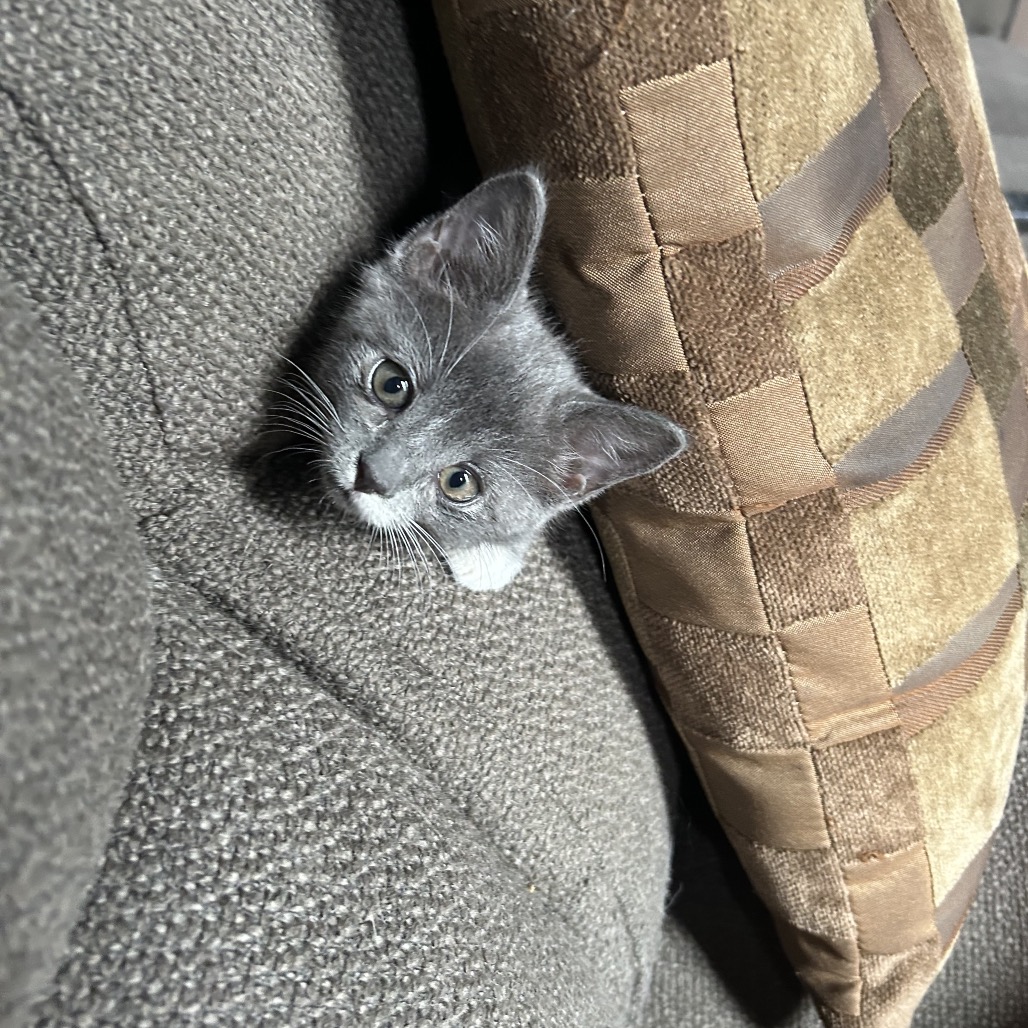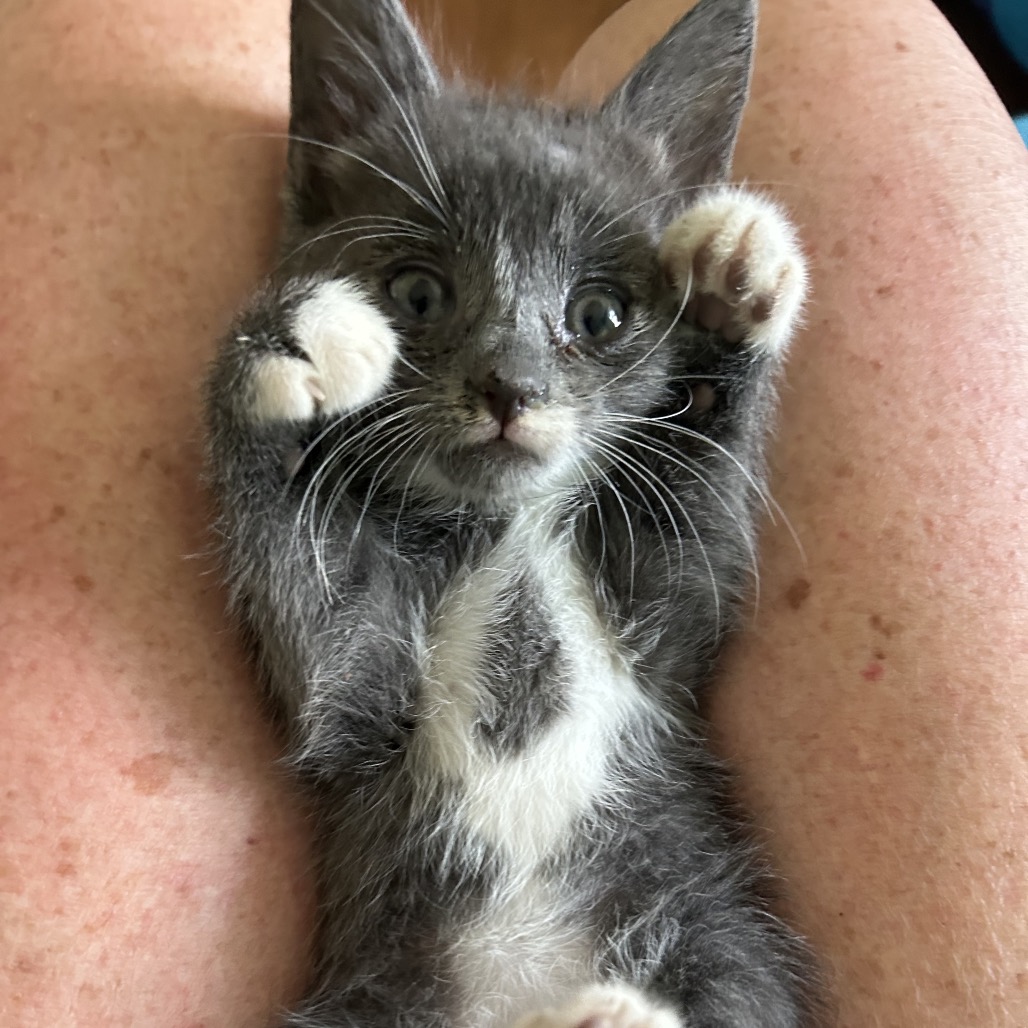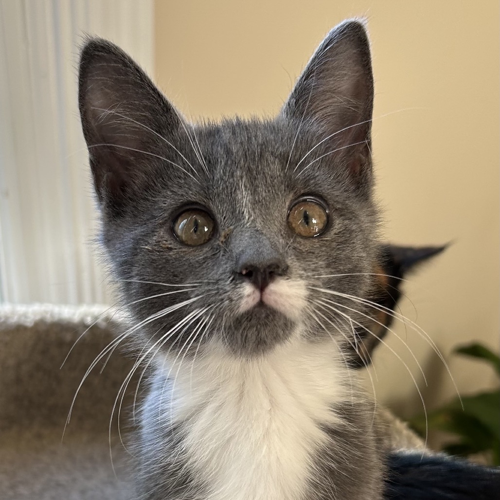 Personality plus!  Energetic!  Snuggle bug!  This adorable kitten loves life.  Malina is very curious and inquisitive and is always on the move. She is frequently running around the house with a fuzzy mouse or ball in her mouth.  She is comfortable being with other cats, and it would be best if Malina has another cat or kitten or dog to play with at home since she is a high energy kitten. While she may play hard, she is still a great lap kitty.  She loves to snuggle with you and take a nap.  She also has a perfect gray teardrop on her chest. Malina has the cutest habit of when she sniffs or smells something, she sounds like a dog sniffing.  One of her favorite things to do when she is getting sleepy is to watch Tom and Jerry videos or play cat games on your phone!  (She even looks like Tom.)  Of course, we do limit her screen time.  There is never a dull moment when Malina is around.