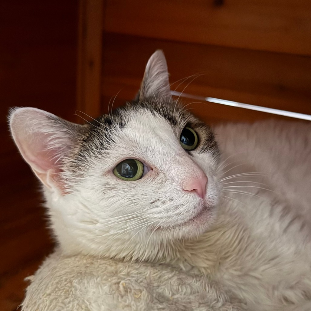 Hello, my name is Mary. As you’ll see in one of my photos, I’m lounging on my foster mom’s white eyelet fabric while she tried to make a summer sundress. She clearly needed my supervision, so I stepped in to help. I love cuddling in her lap whenever it’s available. I have big, expressive green eyes, adore belly rubs, and enjoy just being near you. Every morning I’d patiently wait at the door to greet my foster mom. I’m a little chonky in the middle—who isn’t?—but I’m working on my summer bikini body. Could I be the perfect fit for your home?