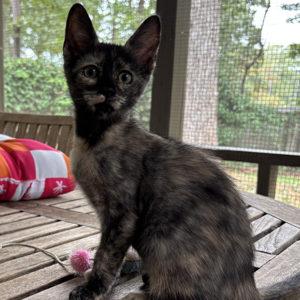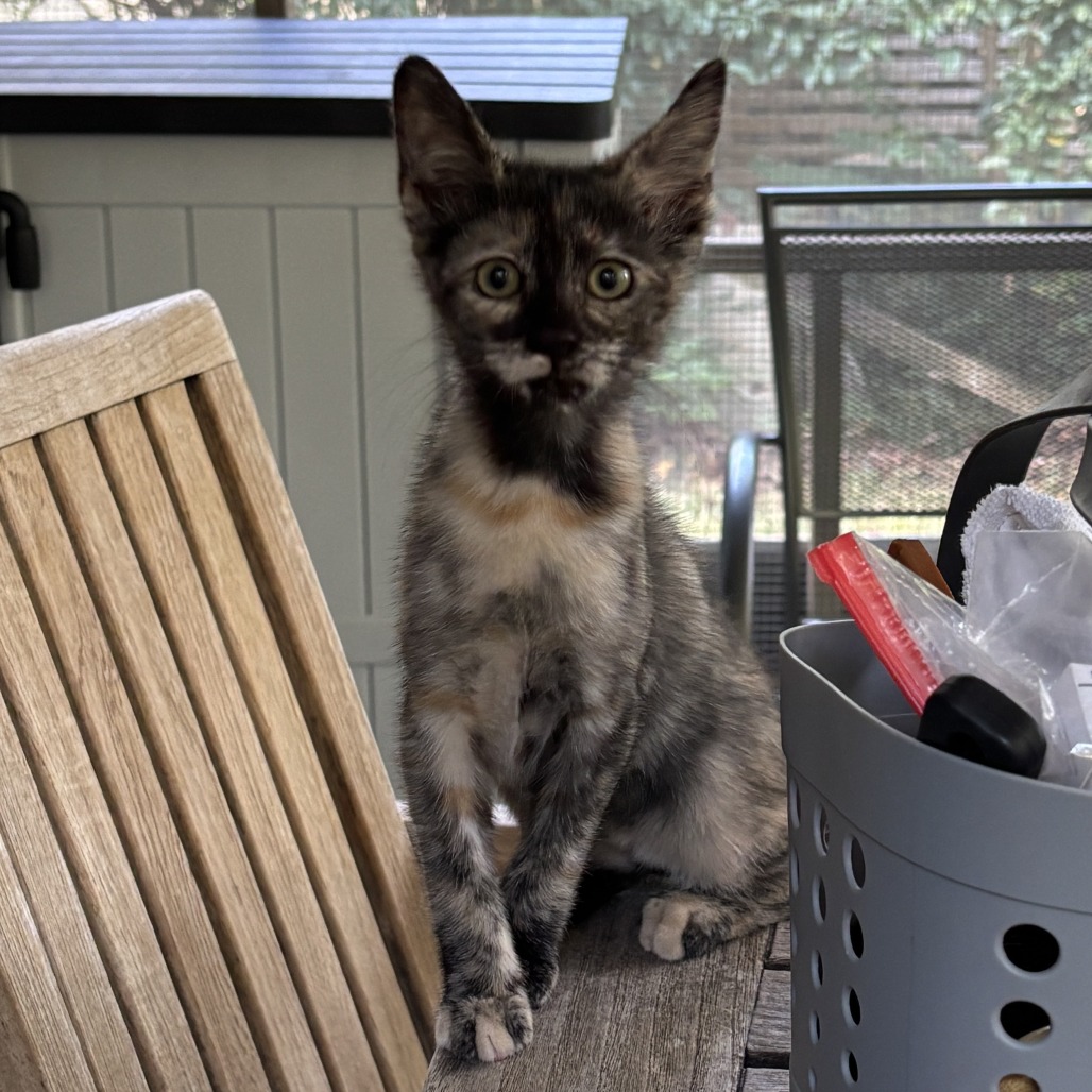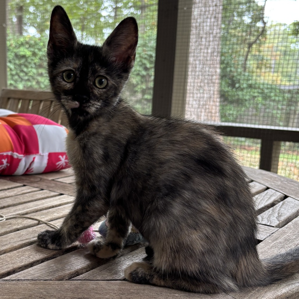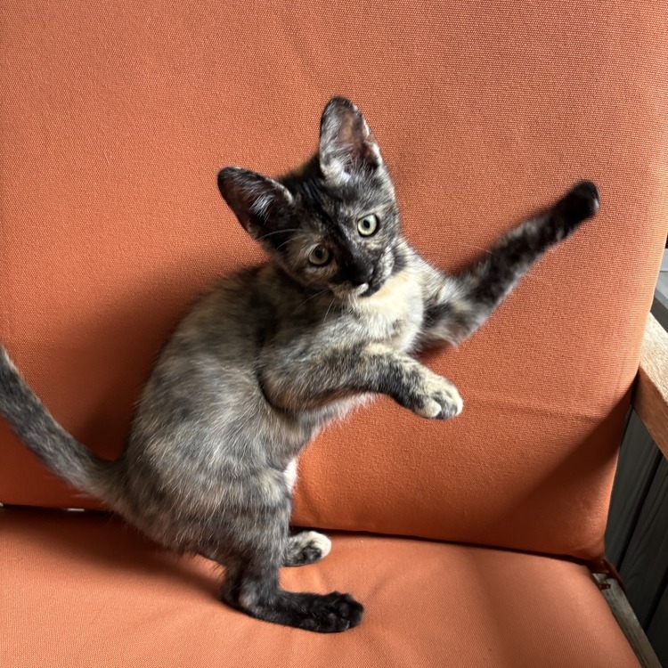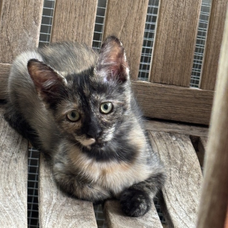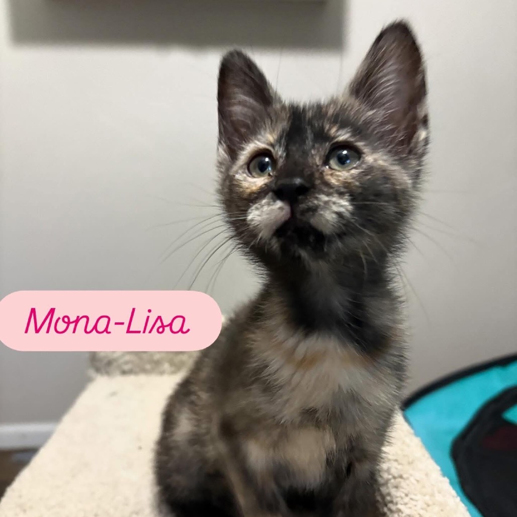 Mona Lisa is a gentle soul with a playful spark. Though she may be shy at first, this affectionate kitten blossoms with patience and love. Over time, she’s grown more confident and cuddly, revealing a tender side that melts hearts. She enjoys quiet playtime and cozy snuggles, and her trust builds steadily with each kind interaction.