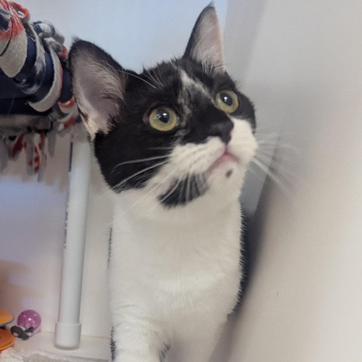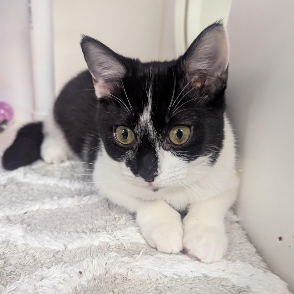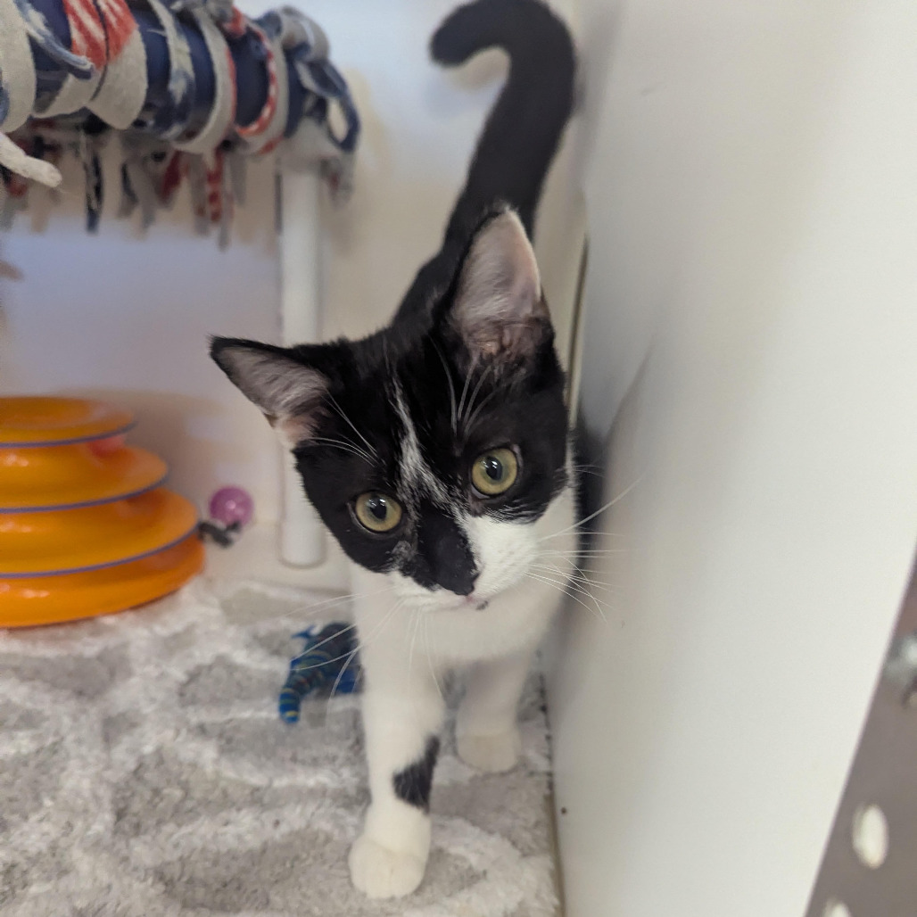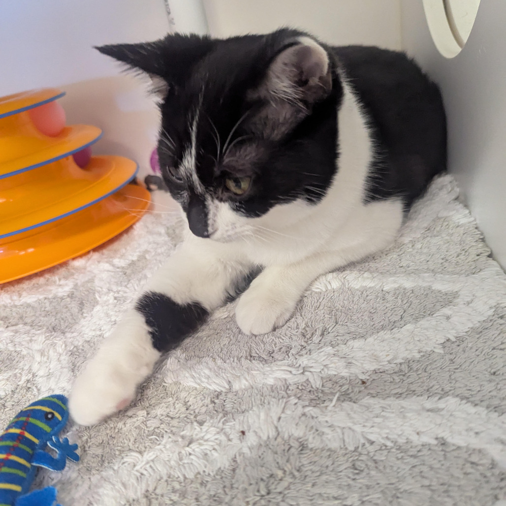 Orzo is an adorable sweet purr machine! She's playful and enjoys pets and cuddles. She has the prettiest markings and beautiful green eyes. Check out that adorable heart spot on her arm! She has a laid back personality and is happy playing with wands and mice toys or relaxing in her comfy cat bed. She is bonded with her sweet sister Farfalle (felv+) and they are patiently waiting for their furever home.
