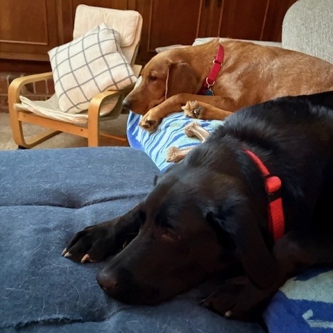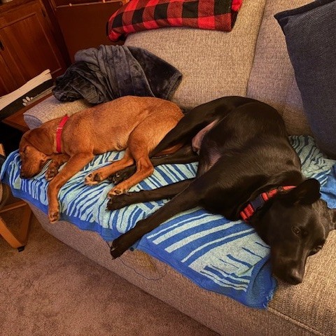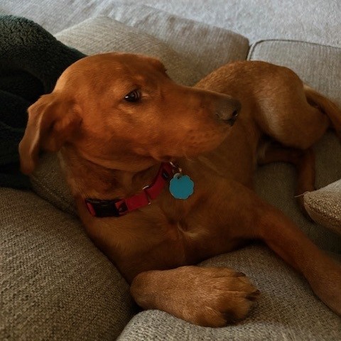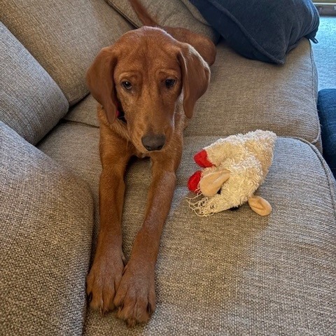 Quinn is house trained and enjoys lounging on her bed or carrying a favorite comfort item, but she is not crate trained and doesn’t like being left alone. She thrives when she has companionship—either a human or another dog—and would likely do best in a home where someone is around during the day. Quinn enjoys walks with her foster siblings, Henry and Addie, and loves exploring outdoors, especially with a calm dog to guide her.