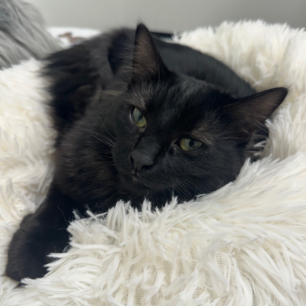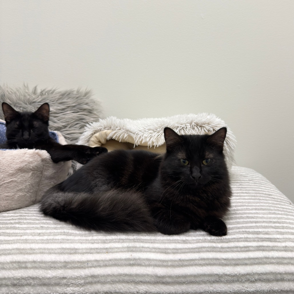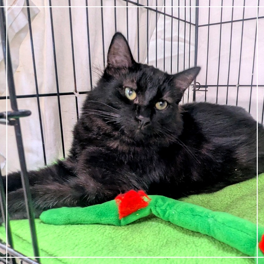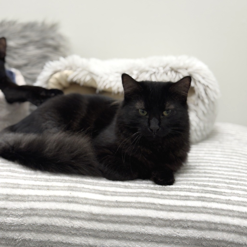 Rascal is an adorable floofy black kitty. He can be a little shy at first but once he gets to know you he's a sweet and silly love bug! He likes to be pet and likes to play with wands. He's also content cuddling with his cat friends. His coloring and eyes are so unique and pretty! This sweet and calm cat will be a great addition to any home.