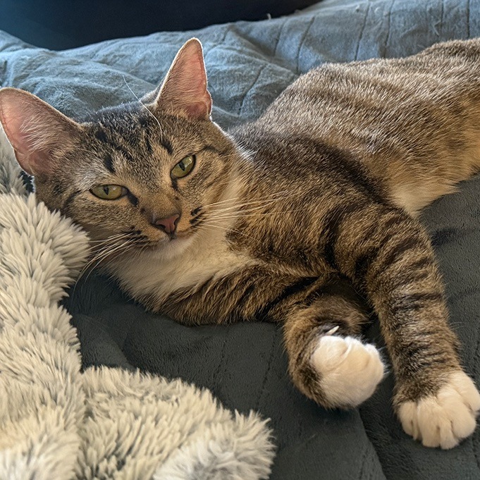 Smokey is a sweet, affectionate young mama who is now spayed and ready for her forever home. After being fostered for several months, she has blossomed into a loving, confident kitty. Though still on the slender side, she’s eating well and gaining strength every day. Smokey adores attention, enjoys cuddles, and loves watching birds from the bed. She’s friendly, playful, and even comfortable around dogs. With her kitten-like energy and gentle nature, she brings joy wherever she goes. Smokey will make a wonderful family companion and is ready to share her love with a home of her own.