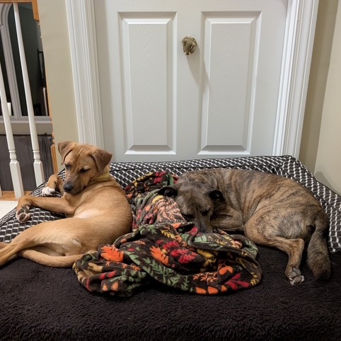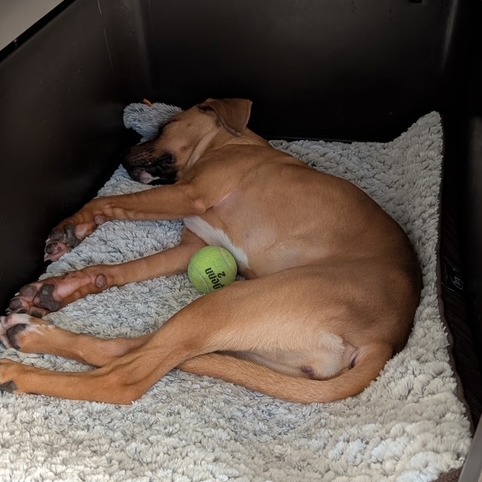 She has calmed down beautifully in her foster home. She’s about 95% potty trained, knows some basic commands, and is very food-motivated, which makes her a quick and eager learner. She loves her crate and often curls up inside on her own when she’s tired. Her fosters haven’t heard her bark, and she’s getting better on leash every day. She also adores snuggling and is good with other dogs.