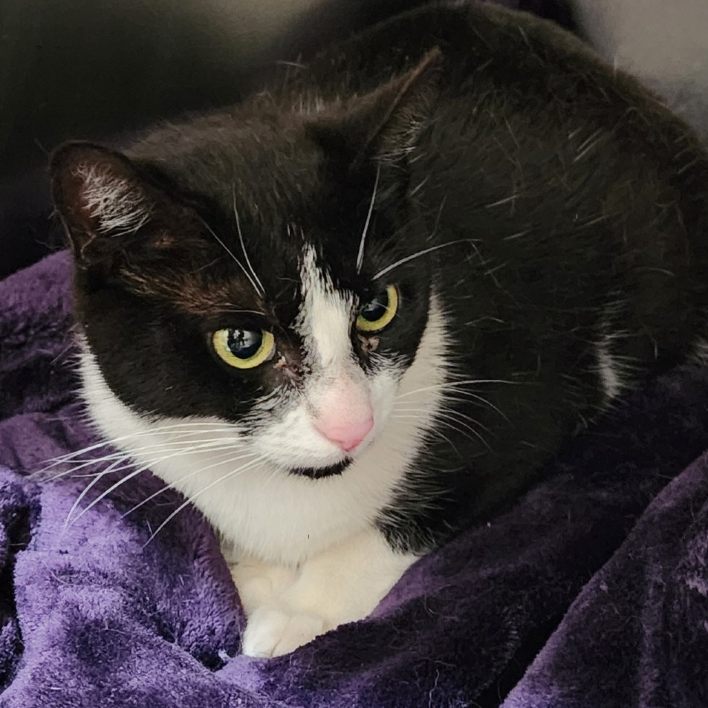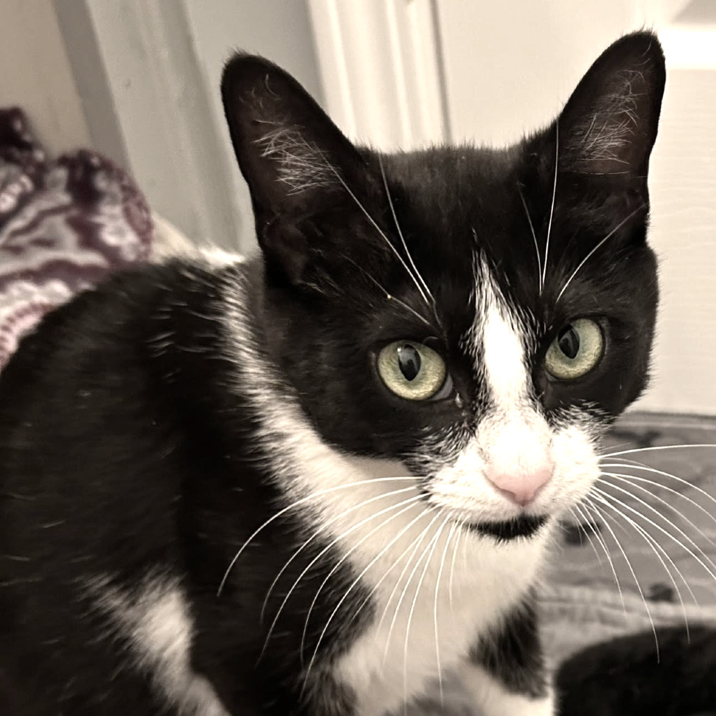 Thomasina is a stunning tuxedo beauty with a heart full of love. She’s been an incredible, protective mama to her four kittens—nurturing them with such care and tenderness. Cautious and observant, Thomasina takes her time to trust, but once she does, she’s incredibly affectionate and loyal. She doesn’t meow like most cats—instead, she communicates with a soft, gentle “click” to get your attention or call for her babies.