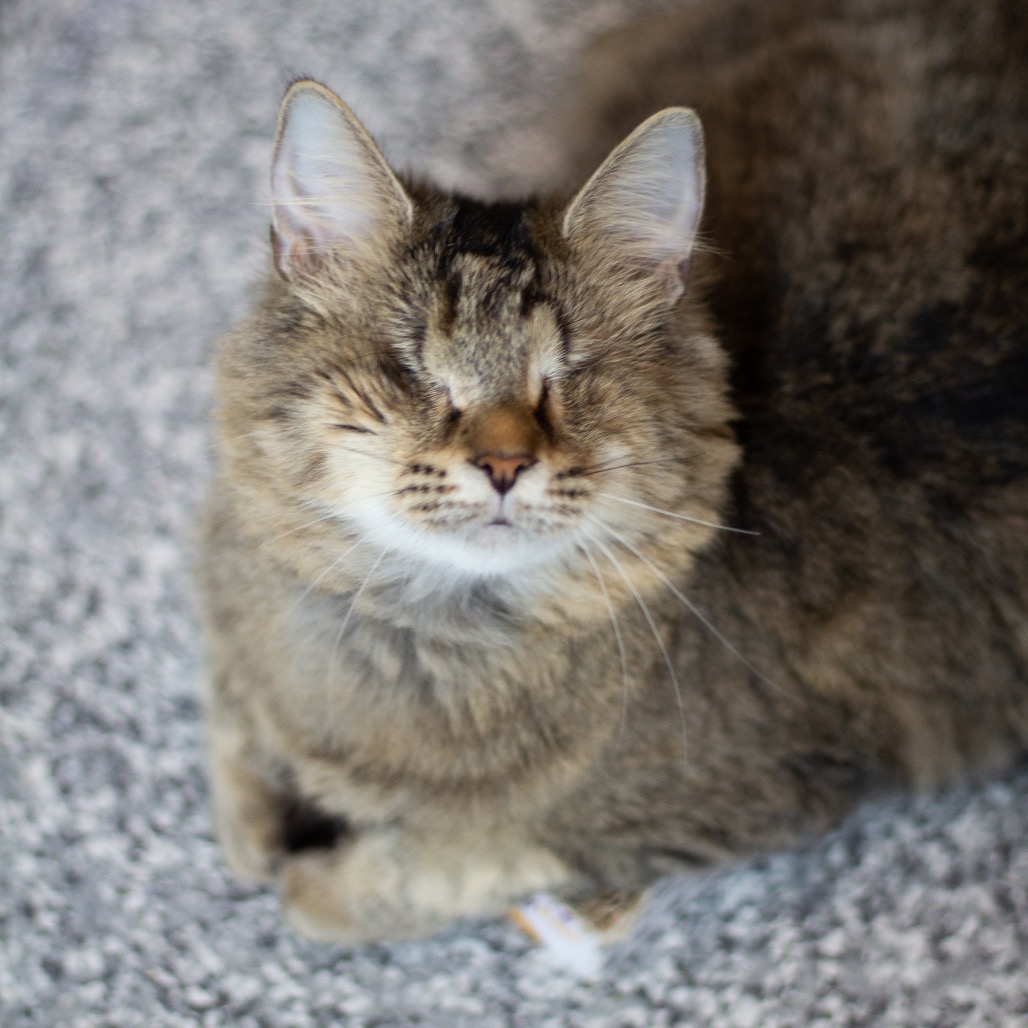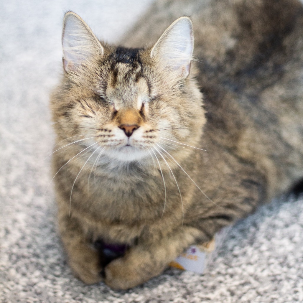 Tink lost both eyes to an infection, but she doesn’t let that slow her down. She hums softly to navigate using echolocation and quickly adjusts to new surroundings. Once she’s settled, Tink is a gentle, affectionate companion who adores neck rubs, quiet cuddles, and resting her forehead against yours. She has a special fondness for instrumental music and thrives in calm, peaceful spaces—though she surprises everyone with her love for noisy foil cat toy balls. If you're patient, nurturing, and appreciate quiet companionship, Tink will become your devoted little shadow, always happy to curl up beside you on the couch or in bed.