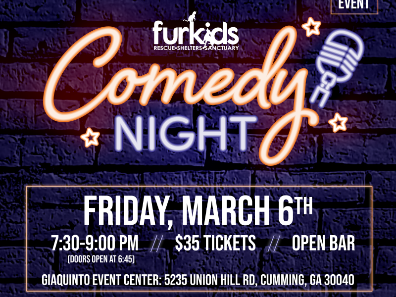 Join us for Comedy Night on Friday, March 6 at the Giaquinto Event Center at Shiloh Gardens (5235 Union Hill Rd, Cumming, GA 30040.)