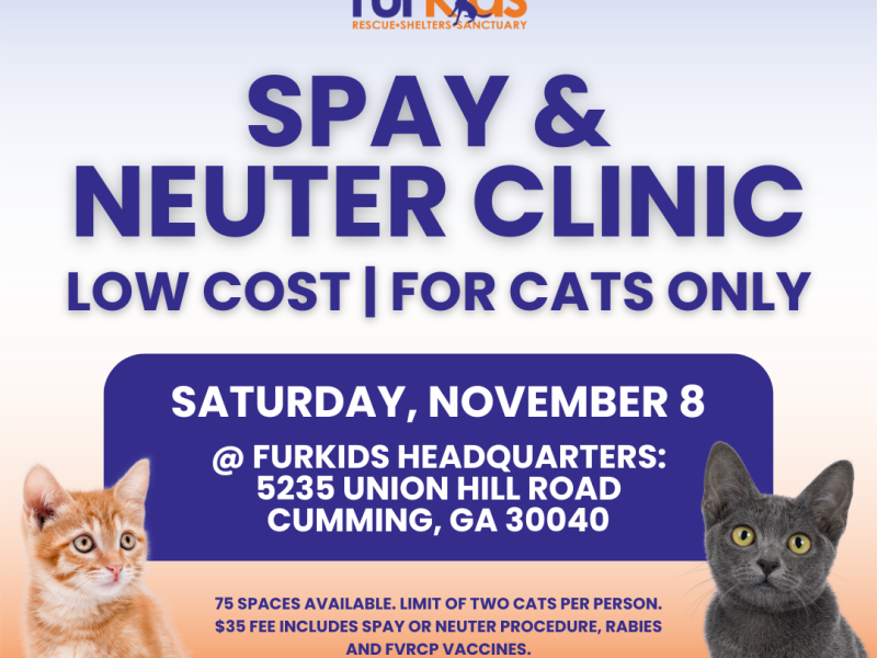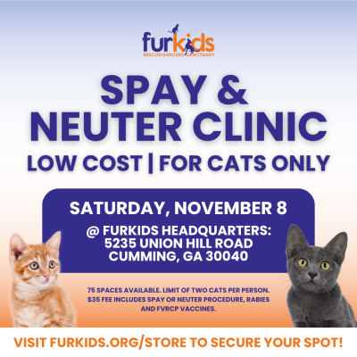 Furkids is excited to host another low-cost spay & neuter clinic for cats at Furkids Headquarters (5235 Union Hill Road in Cumming, GA) on Saturday, November 8th! We would like to offer a special thanks to FixGeorgiaPets for their contributions in making this possible!